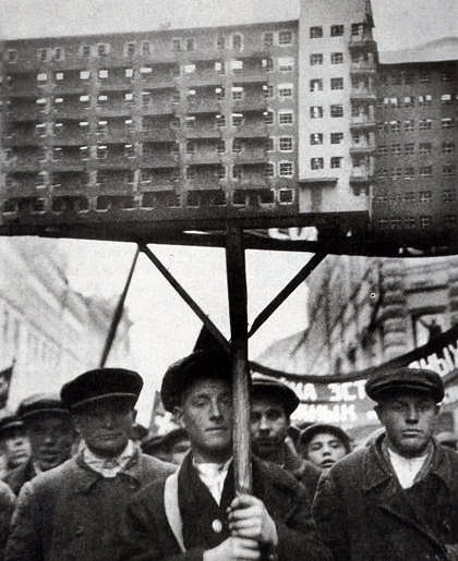 Treballadors soviètics porten una maqueta de vivenda social durant una manifestació. Mocú 1930